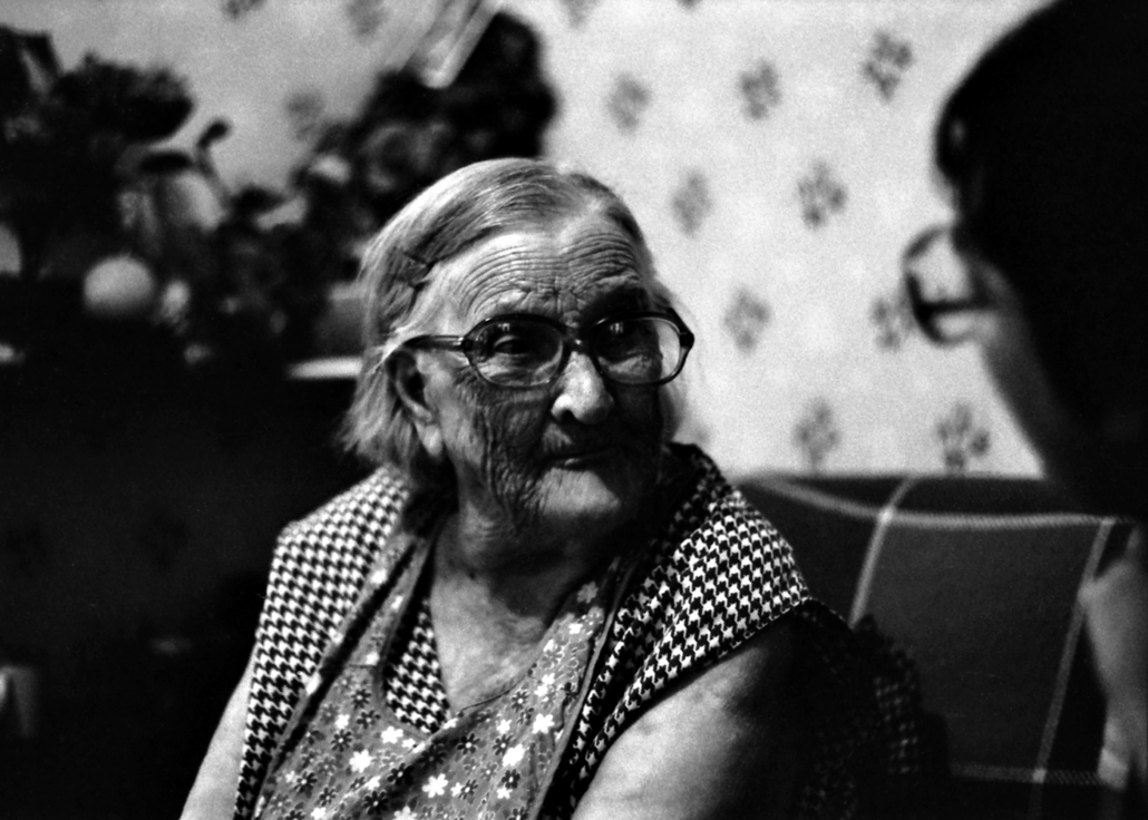Olive Basque, chanteuse de Néguac (Nouveau-Brunswick) enregistrée par Robert Bouthillier et Vivian Labrie en 1976, interprète le premier couplet du medley À la claire fontaine (AFEUL, collection Bouthillier-Labrie, enregistrement n°1697). Photo R. Bouthillier.