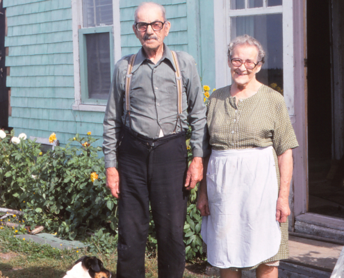 Éphrem et Basilisse Godin devant leur maison à Val-Comeau.